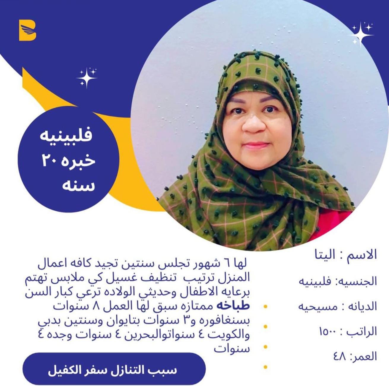 المواهب تامي استلام اي عماله منزليه غير موفقه لدي كفيلها واعادة تاهيلها للكفيل الجديد.💫