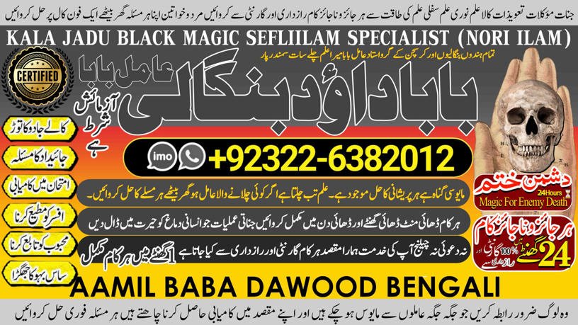 Amil Baba Dawood Bangali { PAK: 0322-6382012  —- UAN: 0092-322-6382012}  is a renowned spiritual healer and master of ancient occult sciences, specializing in Black Magic, Sephi Ilam, Nori Ilam, and Voodoo Spells. With decades of experience in the mystical arts, he has gained a reputation as a powerful and trusted guide for those seeking solutions to life’s most challenging problems.