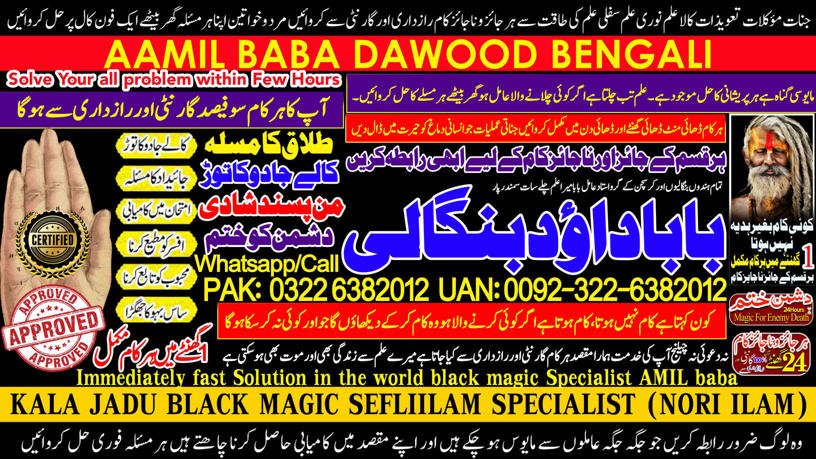 Amil Baba Dawood Bangali { PAK: 0322-6382012  —- UAN: 0092-322-6382012}  is a renowned spiritual healer and master of ancient occult sciences, specializing in Black Magic, Sephi Ilam, Nori Ilam, and Voodoo Spells. With decades of experience in the mystical arts, he has gained a reputation as a powerful and trusted guide for those seeking solutions to life’s most challenging problems.