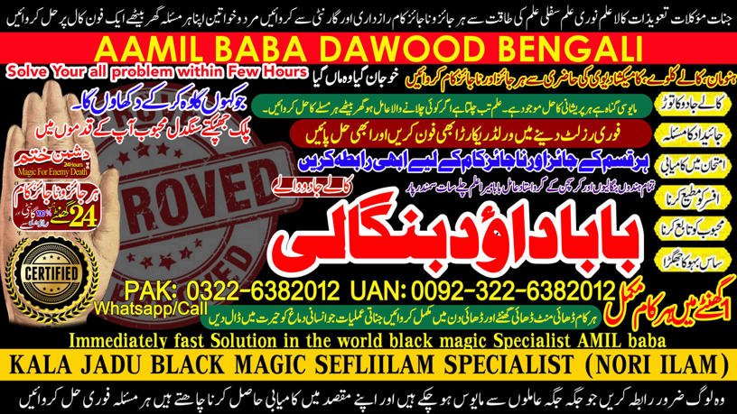 Amil Baba Dawood Bangali { PAK: 0322-6382012  —- UAN: 0092-322-6382012}  is a renowned spiritual healer and master of ancient occult sciences, specializing in Black Magic, Sephi Ilam, Nori Ilam, and Voodoo Spells. With decades of experience in the mystical arts, he has gained a reputation as a powerful and trusted guide for those seeking solutions to life’s most challenging problems.